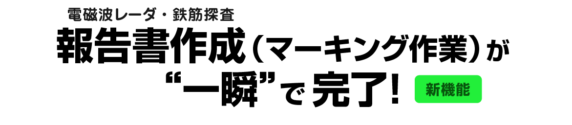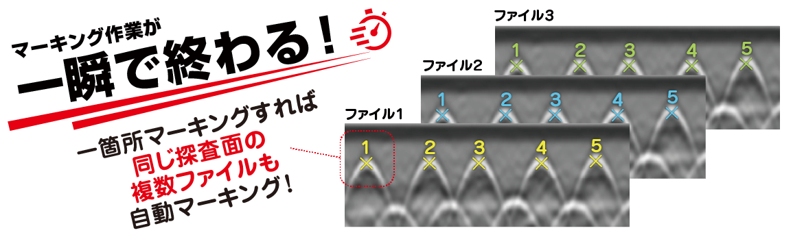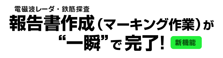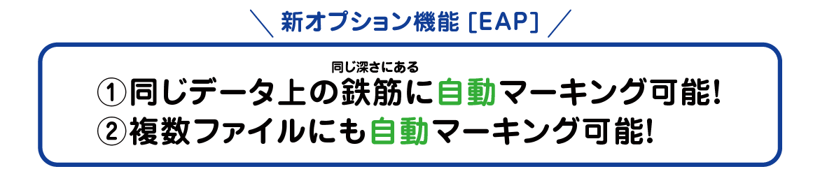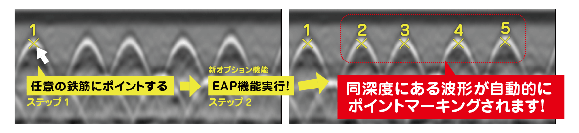 新オプション EAP機能とは?・・・いつもの報告書作成が10倍速くなる![同深度の波形]&[同探査面の複数側線ファイル]へ自動マーキングが可能になる機能です!鉄筋などの波形にひとつひとつマーキングをしていく作業が終わらない・・・そんなお悩みを"一瞬”で解決できます。